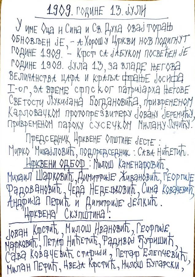 Важно је напоменути да је приликом реконструкције звоника, која је у току, постављен нови крст са јабуком, а из старог извађен запис. Запис је исписан на пергаменту и био је заливен уљем и његов садржај је прочитан у парохијском дому.