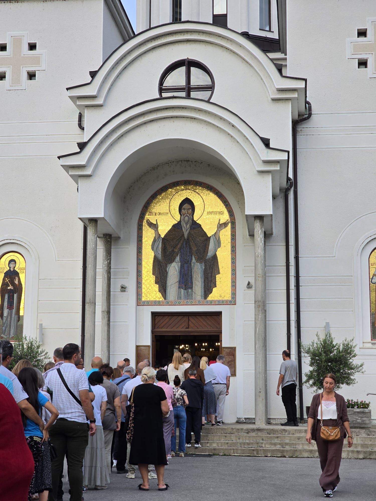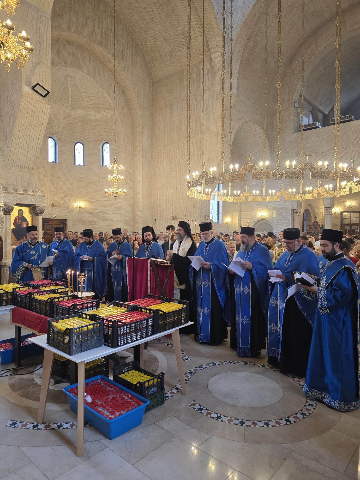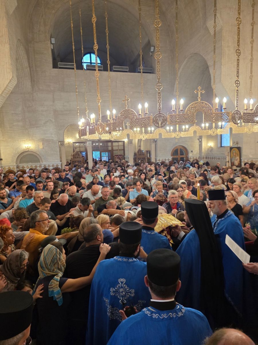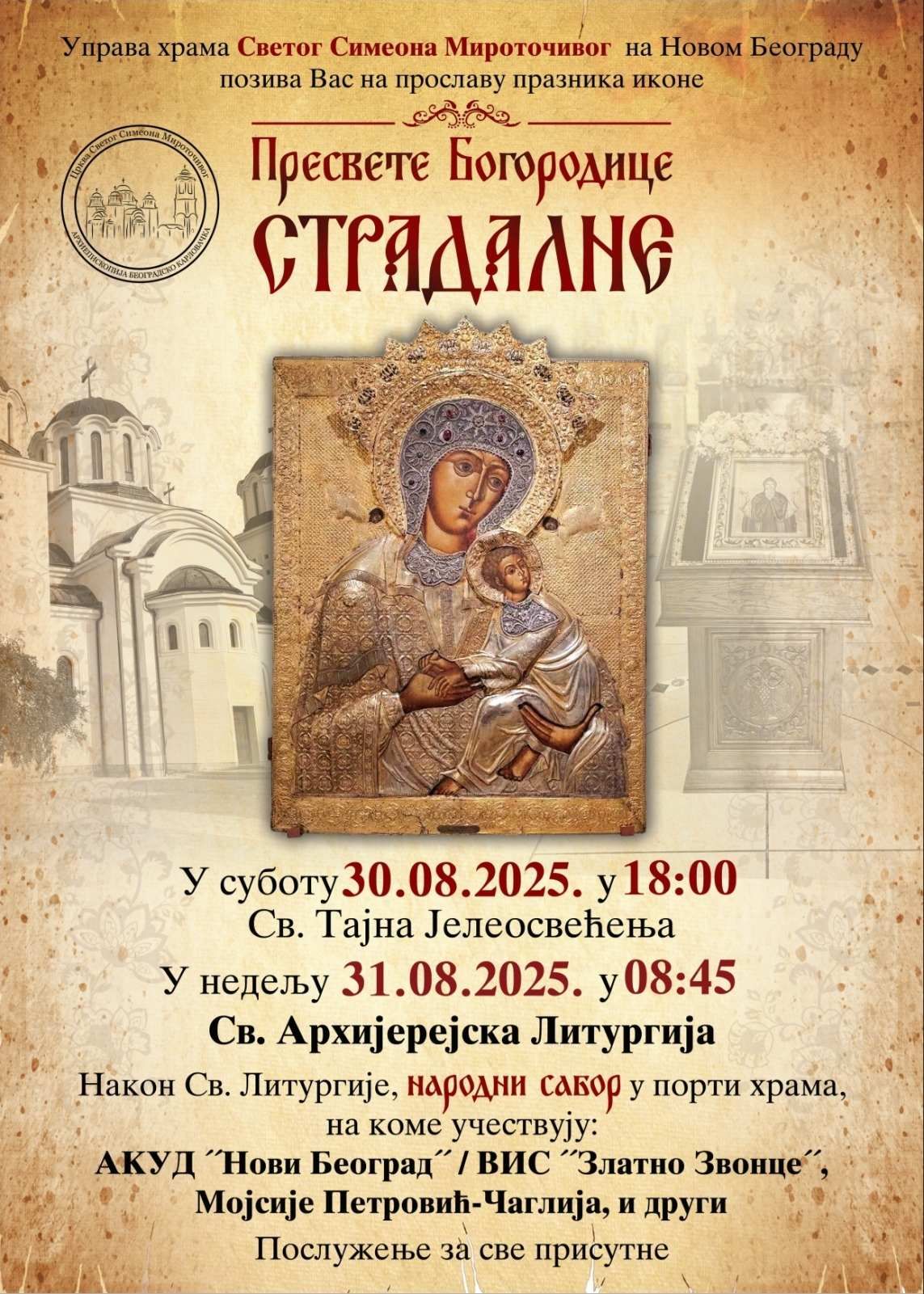 Светој тајни јелеосвећења пред Иконом Богородице Страдалне је молитвено учествовало више стотина верних. Икона је донета поводом молитвене прославе празника Пресвете Богородице из Музеја Српске Православне Цркве у Београду и остаће у храму до 3. септембра, до када ће се свакодневно служити света Литургија са почетком у 7,30 часова, као и молебни канон за болесне са почетком у 18 часова. На сам дан празника, 31. августа 2025. године, са почетком у девет часова, свету архијерејску Литургију ће служити Патријарх српски Порфирије. После свете Литургије ће у порти храма уследити народни сабор обогаћен културно-уметничким програмом у којем ће учествовати културно-уметничка друштва са Новог Београда, етно група Звонце и хор Мојсије Петровић.