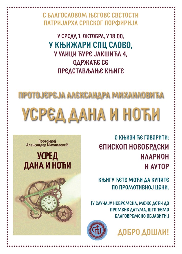 Са благословом Његове Светости Патријарха српског г. Порфирија, у среду, 1. октобра 2025. године, са почетком у 18 часова у црквеној књижари Слово (ул. Ђуре Јакшића бр. 4) биће одржано представљање књиге Усред дана и ноћи протојереја Александра Михаиловића. О књизи ће говорити Преосвећени Епископ новобрдски г. Иларион и аутор.