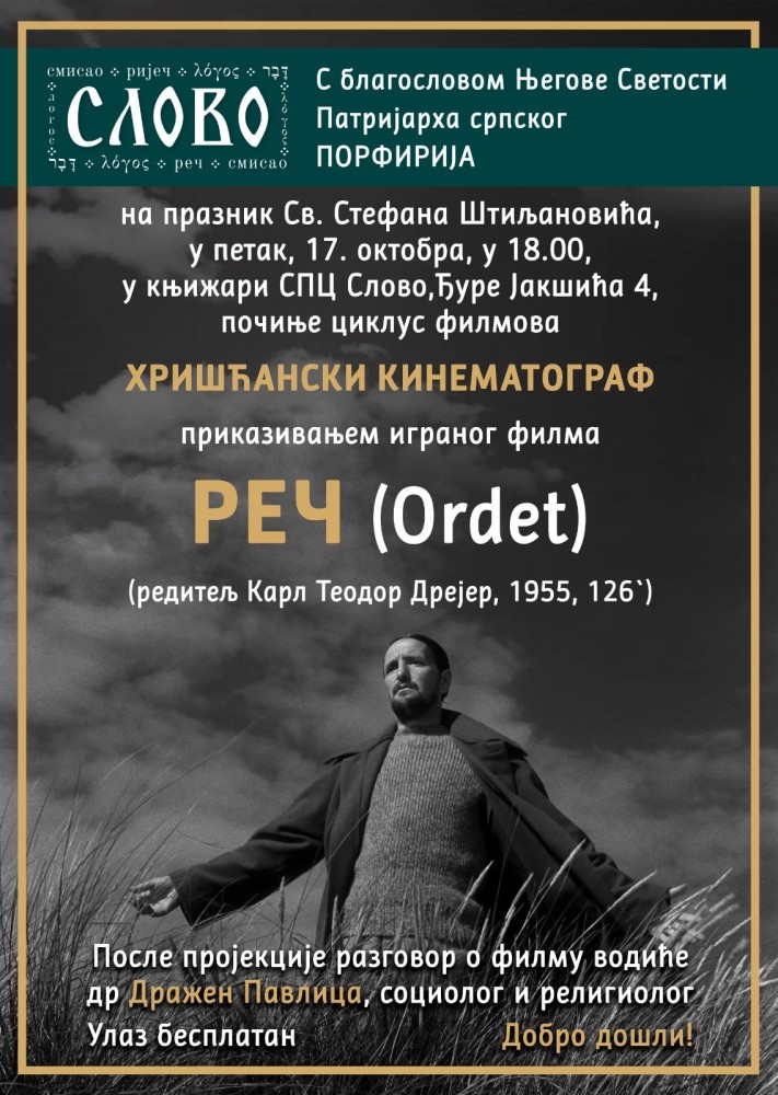 Са благословом Његове Светости Патријарха српског г. Порфирија, на празник Светог Стефана Штиљановића, 17. октобра 2025. године, у 18 часова у црквеној књижари Слово (ул. Ђуре Јакшића бр. 4) циклус филмова Хришћански кинематограф започеће приказивањем играног филма Реч (Ordet) (редитељ Карл Теодор Дрејер, 1955, 126`).