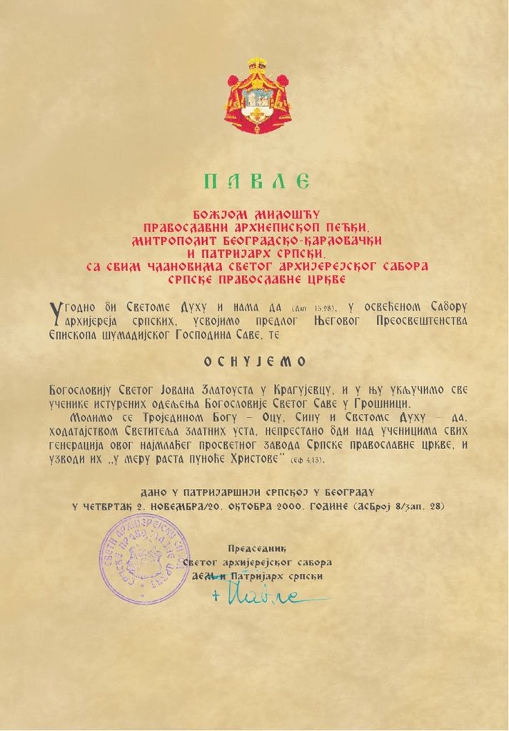 Следећа целина, насловљена Оснивање Богословије Светог Јована Златоуста у Крагујевцу, садржи подсећање како је на иницијативу епископа Саве донета одлука да у јесен 1977. године почне са радом Одељење Београдске богословије Светог Саве у Крагујевцу. Посебно је документовано сведочанство о првом радном дану нове школе у приградском крагујевачком насељу Грошници који су благословили епископи шумадијски Сава и браничевски Игнатије. Нарочито истакнуто место добио је дан пре две и по деценије – проглашење самосталности 26. новембра 2000. године на свечаности у Крагујевцу. Одлуку о томе је 2. новембра 2000. године донео Свети Архијерејски Сабор Српске Православне Цркве.