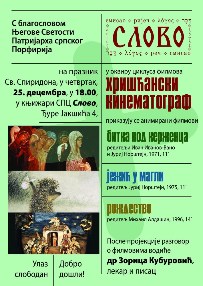У четвртак, 25. децембра 2025. године, са почетком у 18 часова у књижари Слово (ул. Ђуре Јакшића 4) у оквиру циклуса филмова Хришћански кинематограф биће приказани анимирани филмови: Битка код Керженца (редитељи Иван Иванов-Вано и Јуриj Норштејн, 1971, 11`), Јежић у магли (редитељ Јуриj Норштејн, 1975, 11`) и Рождество (редитељ Михаил Алдашин, 1996, 14`).