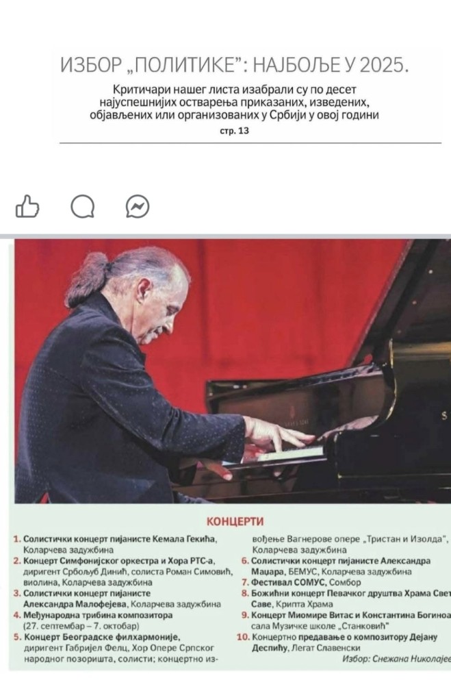 Божићни концерт Певачког друштва храма Светог Саве уврштен је међу десет најзначајнијих концерата 2025. године по избору музичких критичара дневног листа „Политика”.