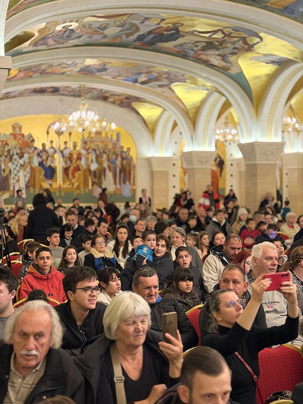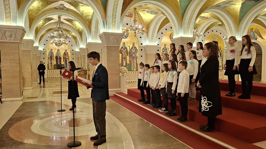 Малишанима, који су дупке испунили крипту заветног храма, обратио се Преосвећени Епископ г. Петар, који је пренео поздрав и благослов Светејшег Патријарха г. Порфирија и нагласио: