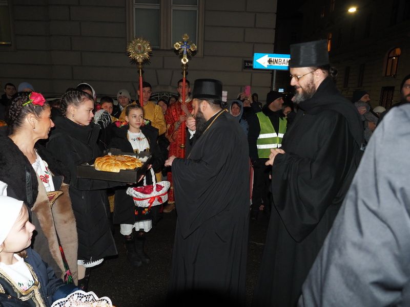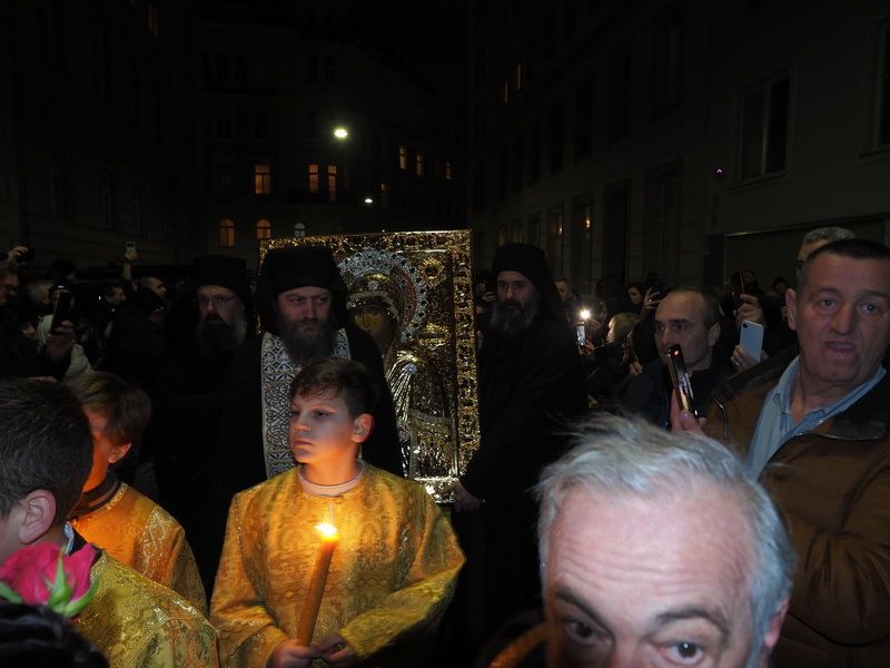 Вечерњем богослужењу и поклоњењу икони великог броја верника присуствовали су Његово Преосвештенство Епископ осечкопољски и барањски г. Херувим, Његово Преосвештенство Епископ мохачки и викар Митрополита бачког г. Дамаскин, високопреподобни игуман хиландарски архимандрит Методије и преподобни монаси те свете обитељи Дамаскин и Тома, ђакони и свештеници Епархије аустријске и Епархије бачке, као и представници верских заједница, дипломатског кора, државних и градских власти, културног и уметничког живота главног града Аустрије.
