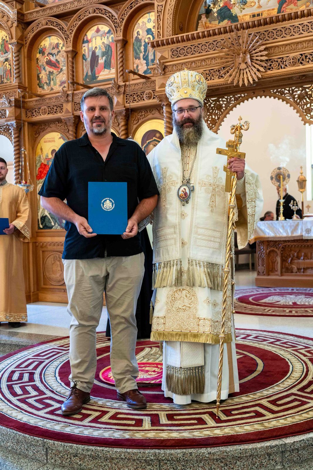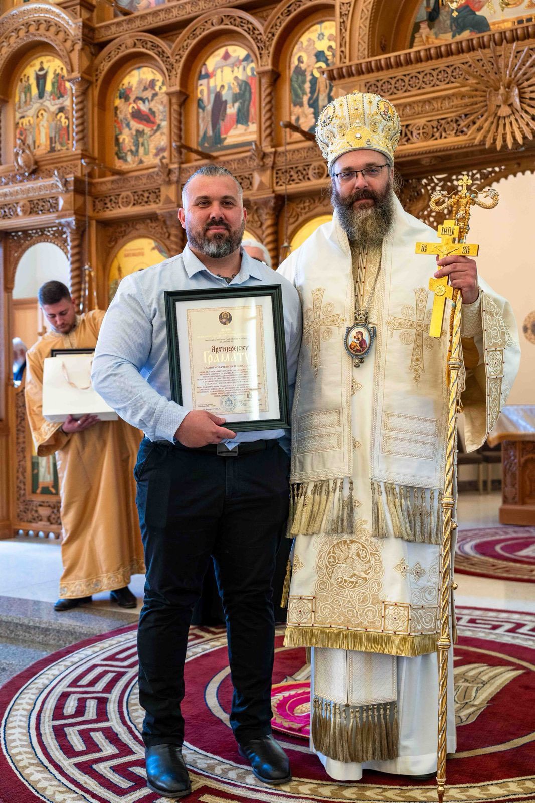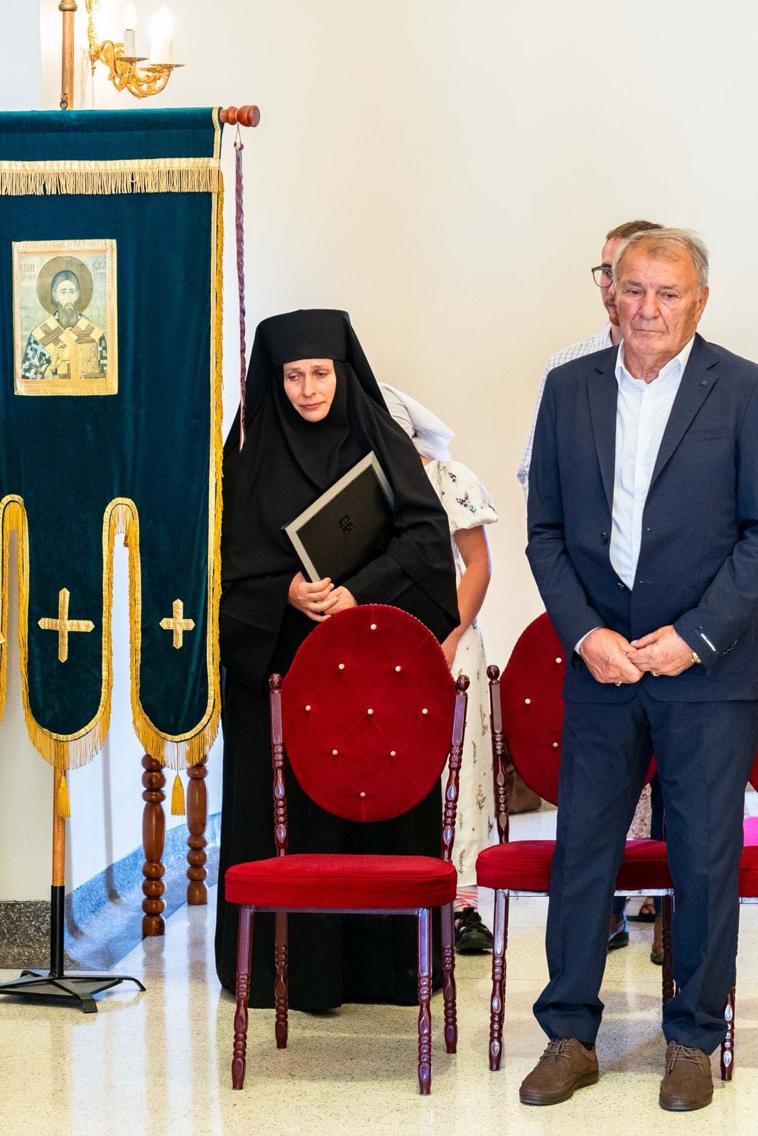 У подвигу и труду са онима којима је од стране Цркве поверено послушање и задужење да предводе обнову и даље организационо, и неопходно у условима манастирског живота, напредовање, исто је видљиво из године у годину, љубављу и трудом многих. Датим поретком, од стране архијереја препознати су путем грамате и захвалнице истакнути дарови и доприноси хришћанске љубави и светосавске вере. Међу њима је и јединствени дар породице Ковачевић из Мелбурна, украсни мозаик лика Светог Саве на порталу храма, у изради уметника неимара Ристе Вујиновића из Требиња. Мозаик је после литије освећен. Овогодишњи домаћин г. Ратко Миличевић је ранији дародавац троносне иконе Богородице Тројеручице и дугогодишњи добротвор, који је по освештаној традицији предао део колача наредним домаћинима из породице Пољчић и Шуваило из Кабрамате.