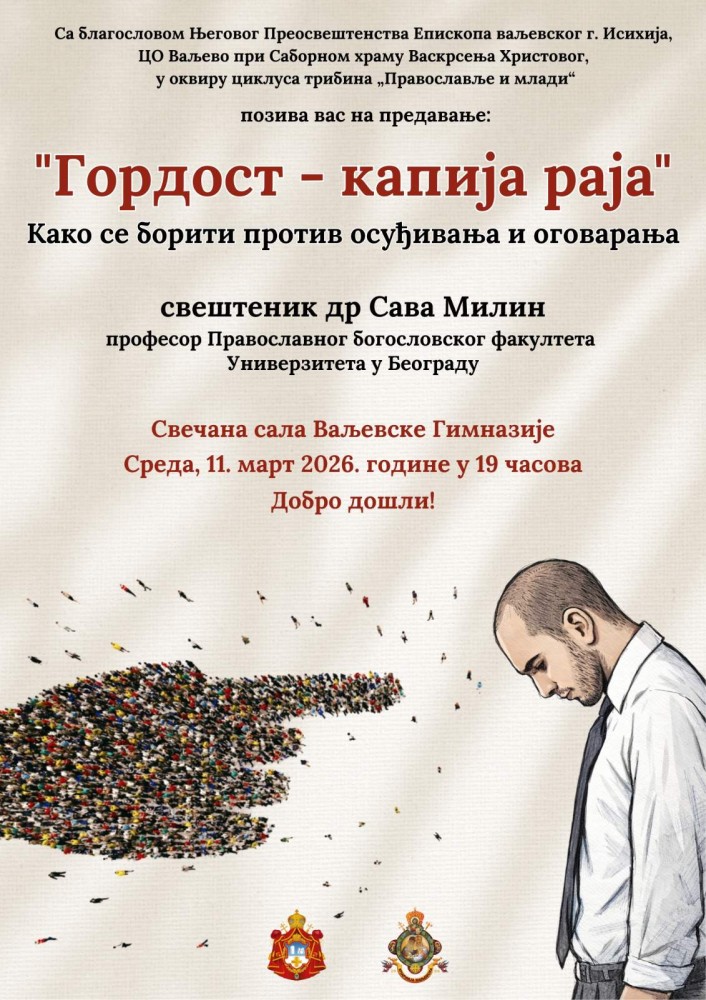 У среду, 11. марта 2026. године, са почетком у 19 часова у свечаној сали Ваљевске гимназије биће одржана трибина „Гордост – капија раја“ у циклусу „Православље и млади“.
