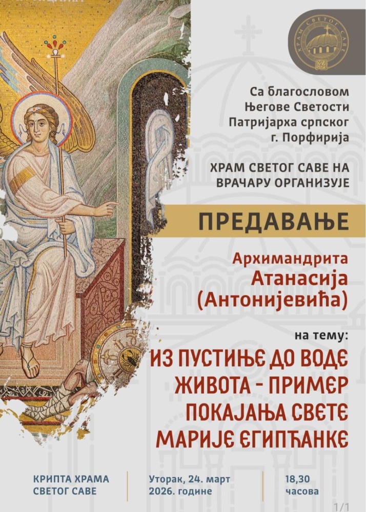 Следећег уторка, 24. марта 2026. године, предавање на тему Из пустиње до воде живота - пример покајања Свете Марије Египћанке одржаће архимандриот Атанасије (Антонијевић).