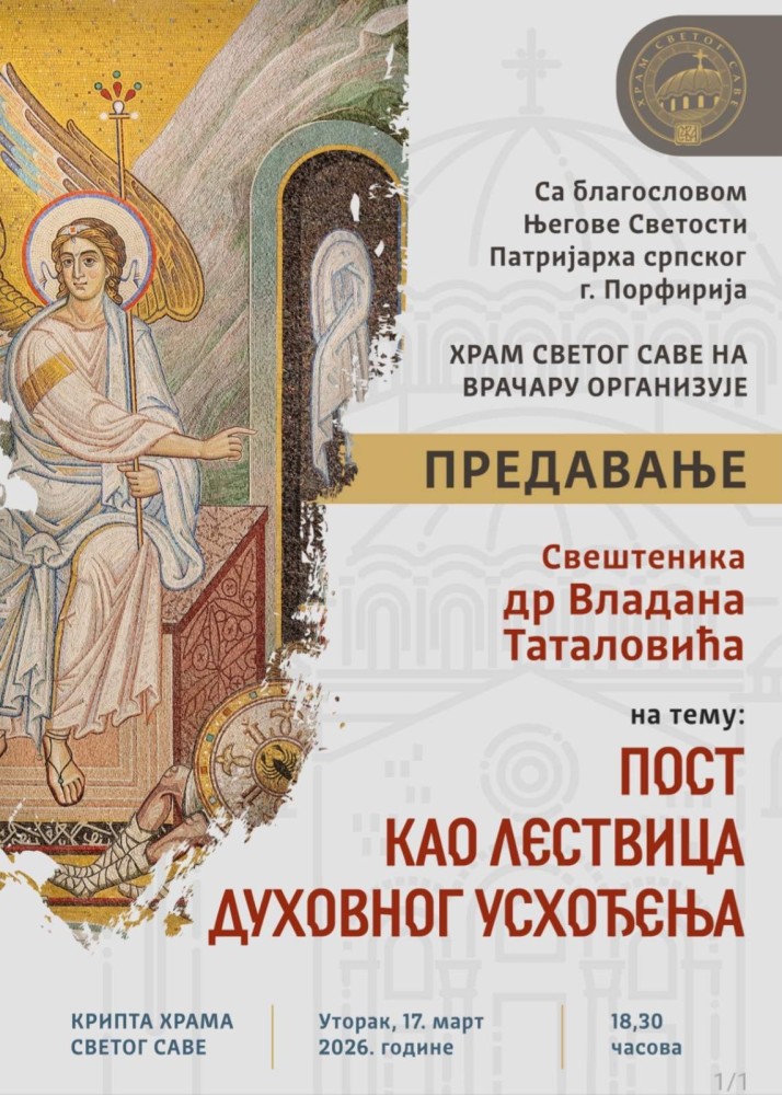 Јереј проф. др Владан Таталовић одржаће 17. марта 2026. године са почетком у 18,30 часова у крипти храма Светог Саве на Врачару предавање на тему Пост као лествица духовног усхиођења.