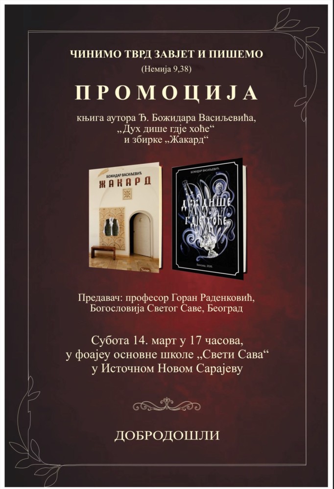 У суботу, 14. марта 2026. године, са почетком у 17 часова у фоајеу Основне школе Свети Сава у Источном Новом Сарајеву биће одржано представљање књига ђакона Божидара Васиљевића Жакард и Дух дише где хоће.