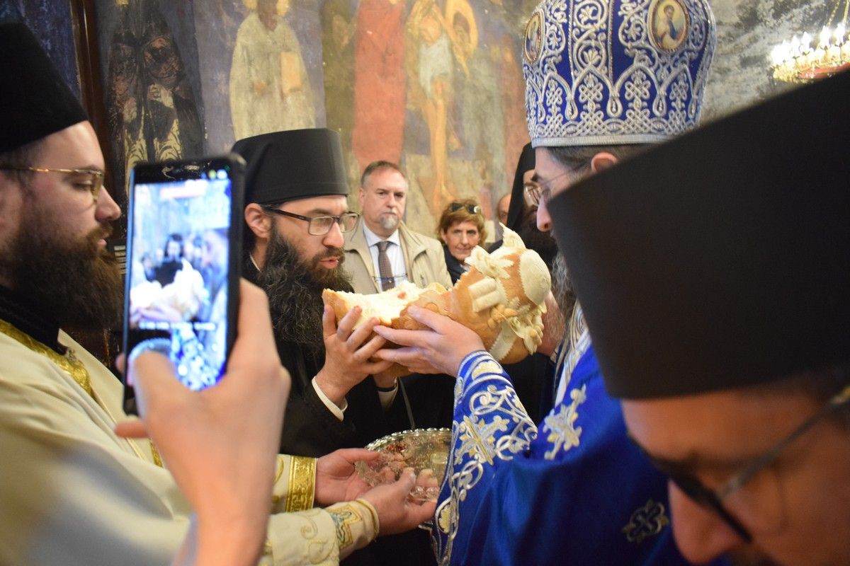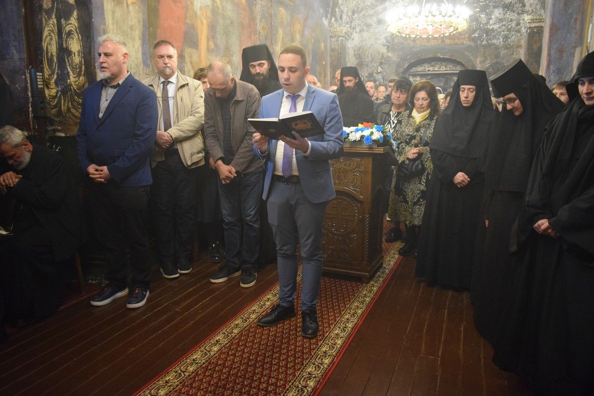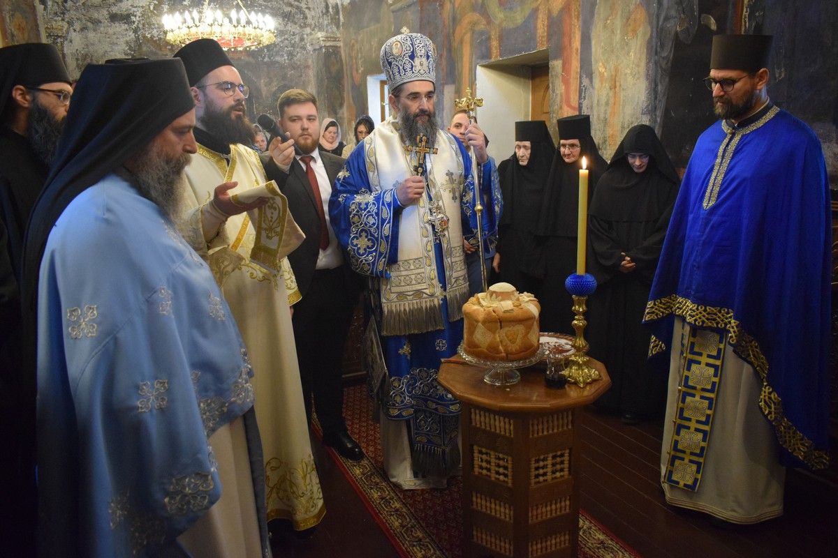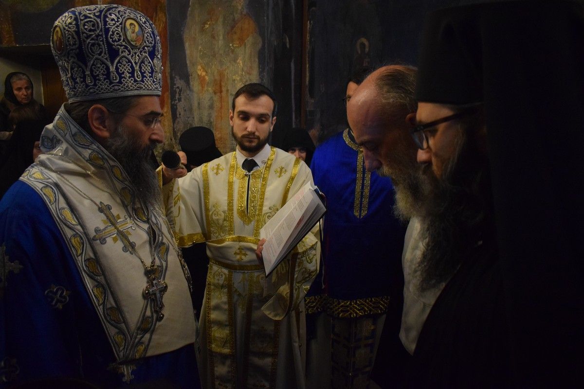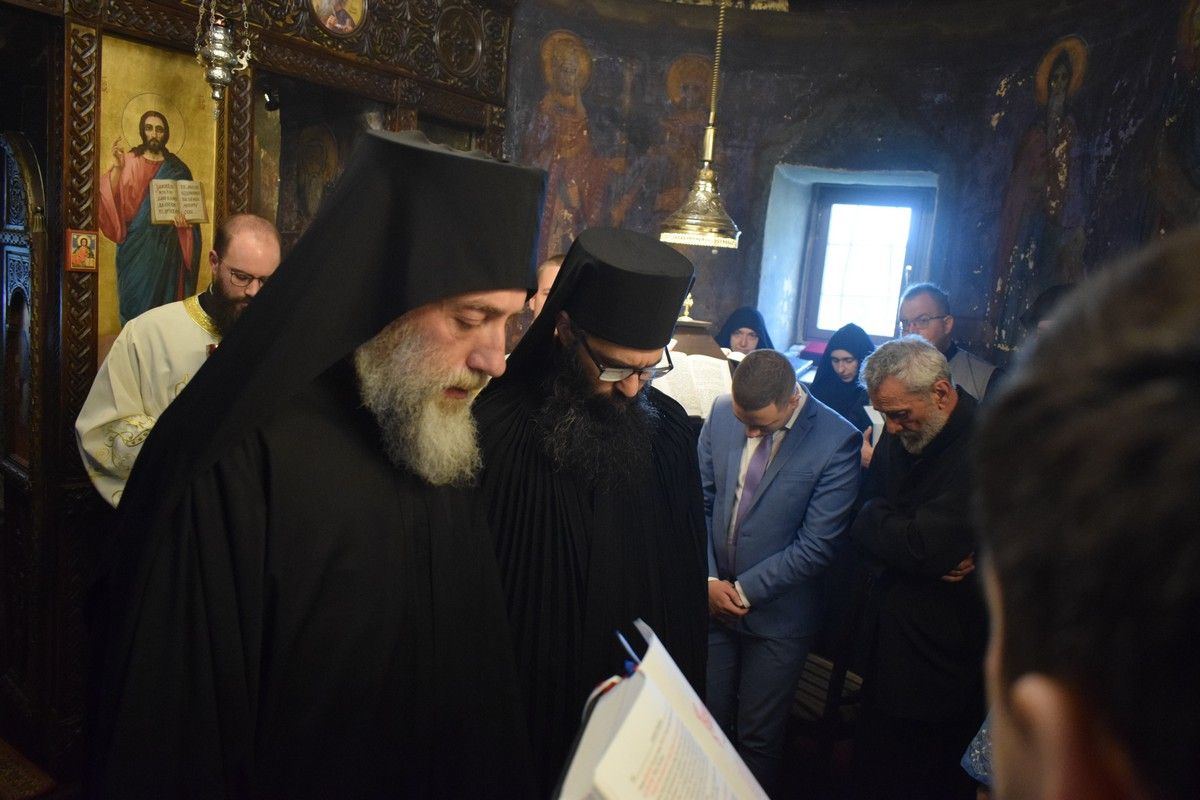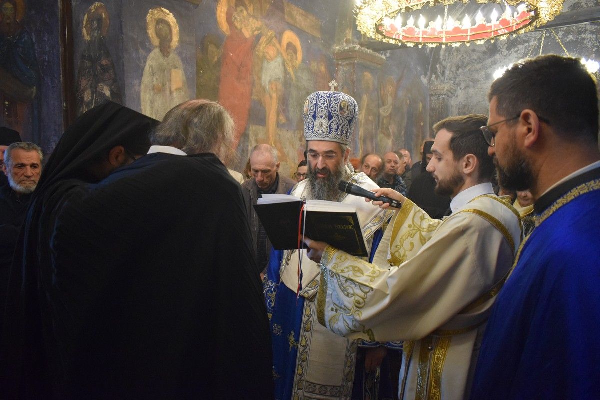 Саслуживали су: протосинђел Енох, сабрат манастира Буково; јереј Бранислав Јоцић из Архиепископије београдско-карловачке; и протођакон Никола Ераковић. На Малом входу литургијског сабрања Високопреосвећени Владика је, по чину одевања расе и камилавке, у монашки чин увео искушеника Радомира, који је понео име Агатон. Светом чину је присуствовало бројно свештенство и монаштво, уз верни народ сабран на литургијску прославу славе древне свете обитељи.