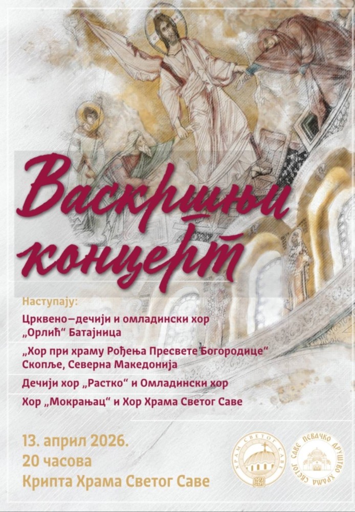 Братство храма Светог Саве на Врачару, са благословом Његове Светости Патријарха српског г. Порфирија, на Васкршњи понедељак организује традиционални Васкршњи концерт у крипти заветне светиње српског народа.