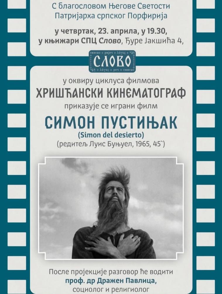 Циклус филмова Хришћански кинематограф у црквеној књижари Слово се наставља у четвртак, 23. априла 2026. године. У 19,30 часова на програму је филм Симон Пустињак редитеља Луиса Буњуела из 1965. године.