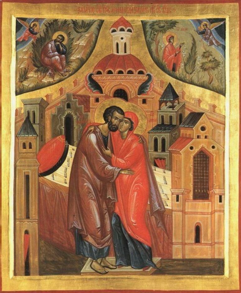 У то исто време анђео се јави и Јоакиму у пустињи и рече: Јоакиме, Јоакиме! услиши Бог молитву твоју и изволи дати теби благодат Своју: ето, жена твоја Ана зачеће и родиће ти кћер, чије ће рођење бити радост за цео свет. И ево ти знака да ти благовестим истину: иди у Јерусалим к храму Божијем и тамо ћеш код Златних Врата наћи супругу своју Ану, којој је ово исто јављено. Задивљен оваком благовешћу ангелском, Јоаким славословећи Бога и благодарећи Му срцем и устима за такво милосрђе, журно са радошћу и весељем крену у Јерусалимски храм. Тамо, као што му рече анђео, он нађе код Златних Врата Ану где се моли Богу, и исприча јој о анђеловој благовести. Исто тако и она њему каза шта виде и чу од анђела који је обавести о рођењу кћери. Тада Јоаким и Ана прославише Бога који им учини тако велику милост, па пошто Му се поклонише у светом храму, вратише се дому свом. И заче света Ана у девети дан месеца децембра, а осмога септембра роди кћер, Пречисту и Преблагословену Дјеву Марију, почетак и посредницу нашег спасења; и њеном се рођењу обрадова небо и земља. И принесе Јоаким Богу велике дарове, жртве и паљенице, и доби благослов од првосвештеника, свештеника, левита и свих људи што се удостоји благослова Божјег. Потом Јоаким приреди у дому свом велико угошћење, и сви се весељаху хвалећи Бога.