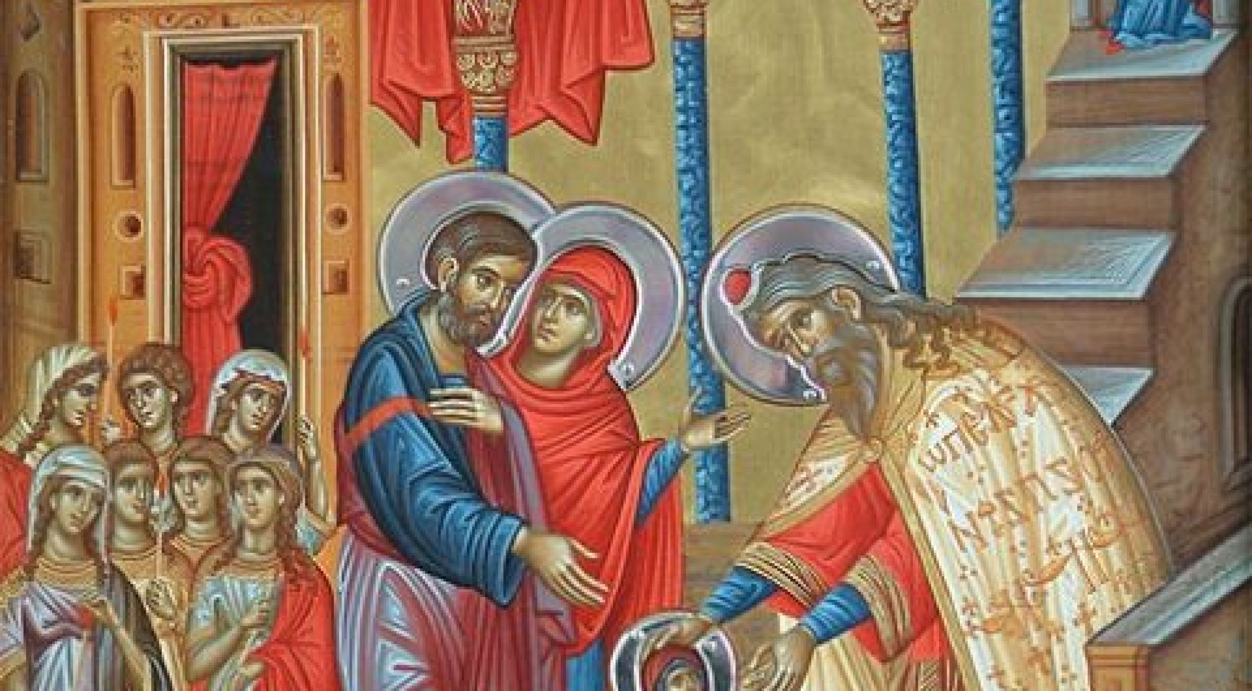 Када се Пресветој Дјеви Марији навршише три године од рођења, свети праведни родитељи њени Јоаким и Ана одлучише да је предаду Богу на службу према ранијем обећању своме. Стога они сазваше у Назарет, где живљаху, све своје сроднике из царског и архијерејског рода, – јер сам праведни Јоаким бејаше из царскога рода, a cyпруга његова света Ана бејаше из архијерејскога рода, – а исто тако и хор беспрекорних девица. Притом они спремише много свећа и украсише Пречисту Дјеву Марију царским благољепијем, као што о томе сведоче свети Оци.