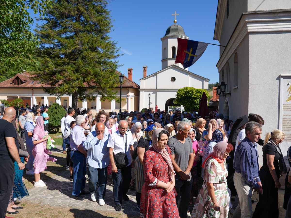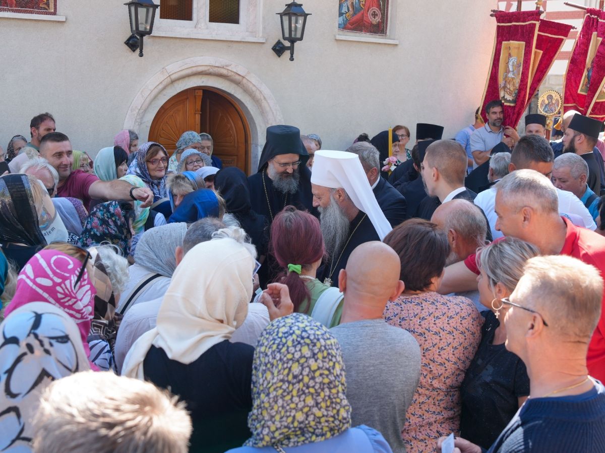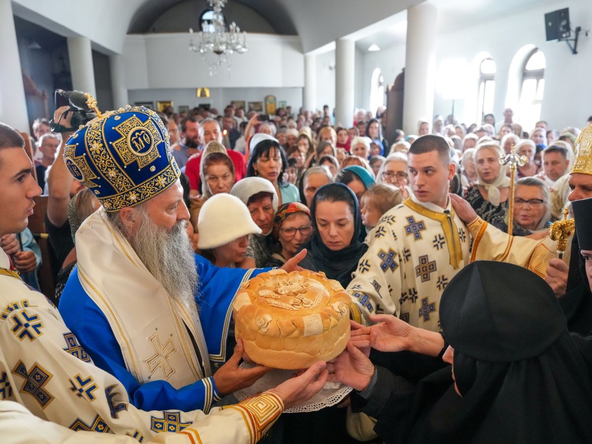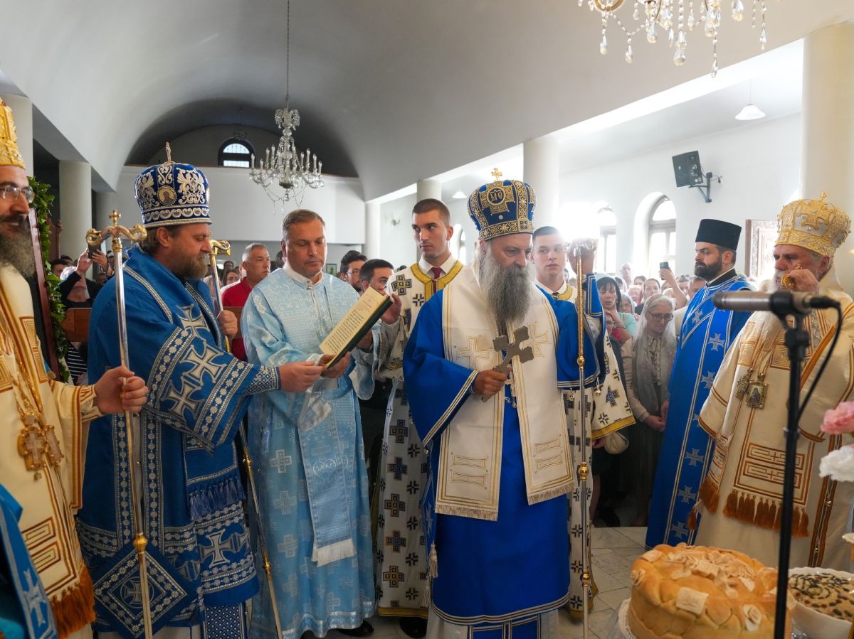 После читања светог Јеванђеља Светејши Патријарх је беседио о значају Пресвете Богородице, истичући Њену улогу као Мајке свих верника и Лествице која спаја небо и земљу. Нагласио је да је Богородица своје биће учинила најсветијим престолом, а кроз смирење, веру и поверење у промисао Божји постала је најузвишеније биће кроз које Бог говори нама, а и ми Њом говоримо Богу:
