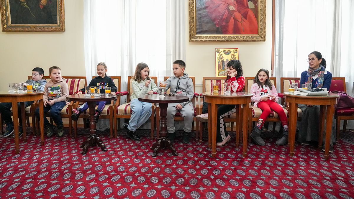 Његова Светост Патријарх српски г. Порфирије је угостио 30. децембра 2025. године у Патријаршијском двору у Београду ученике издвојеног одељења основне школе у Новим Козарцима код Кикинде.
