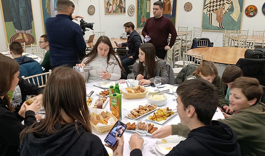 Његова Светост је затим у Парохијском дому Светосавског храма на Врачару приредио трепзу љубави за мале Светосавце из Приједора, Херцег Новог и Грахова.