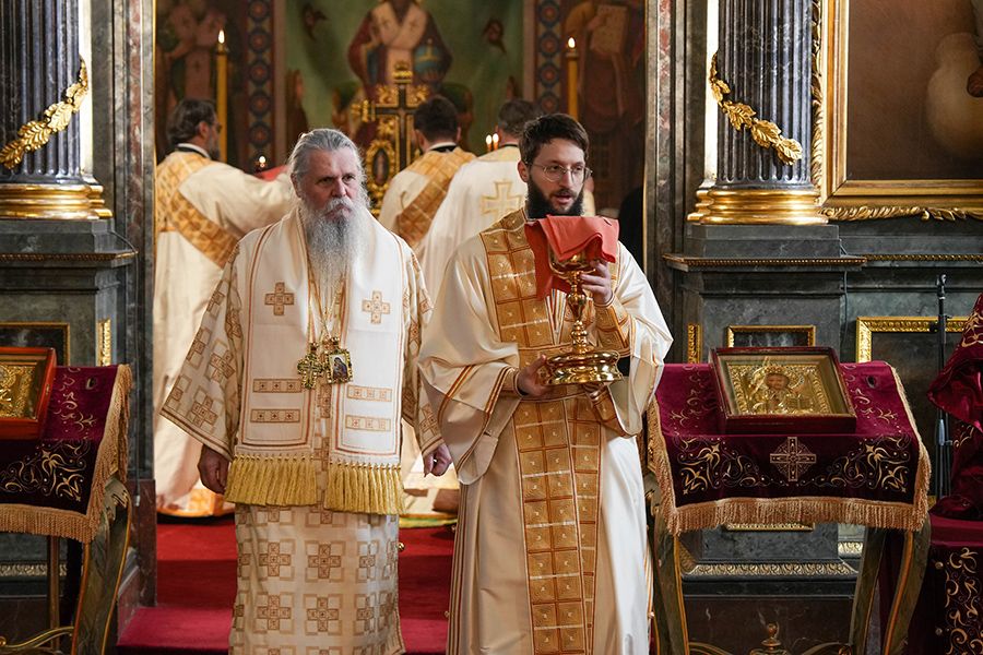 Торжественом Литургијом је началствовао предстојатељ Српске Православне Цркве уз саслужење: високопреосвећене господе митрополита црногорско-приморског Јоаникија, врањског Пахомија, шумадијског Јована, милешевског Атанасија, нишког Арсенија, далматинског Никодима и будимљанско-никшићког Методија; и преосвећене господе епископа буеносајреског и јужно-централноамеричког Кирила, осечкопољског и барањског Херувима, шабачког Јеротеја, лондонског и великобританско-ирског Нектарија, ремезијанског Стефана, хвостанског Алексеја, новобрдског Илариона, топличког Петра и јенопољског Никона; уз молитвено учешће Високопресвећеног Митрополита браничевског г. Игнатија и преосвећене господе епископа липљанског Доситеја и моравичког Тихона.