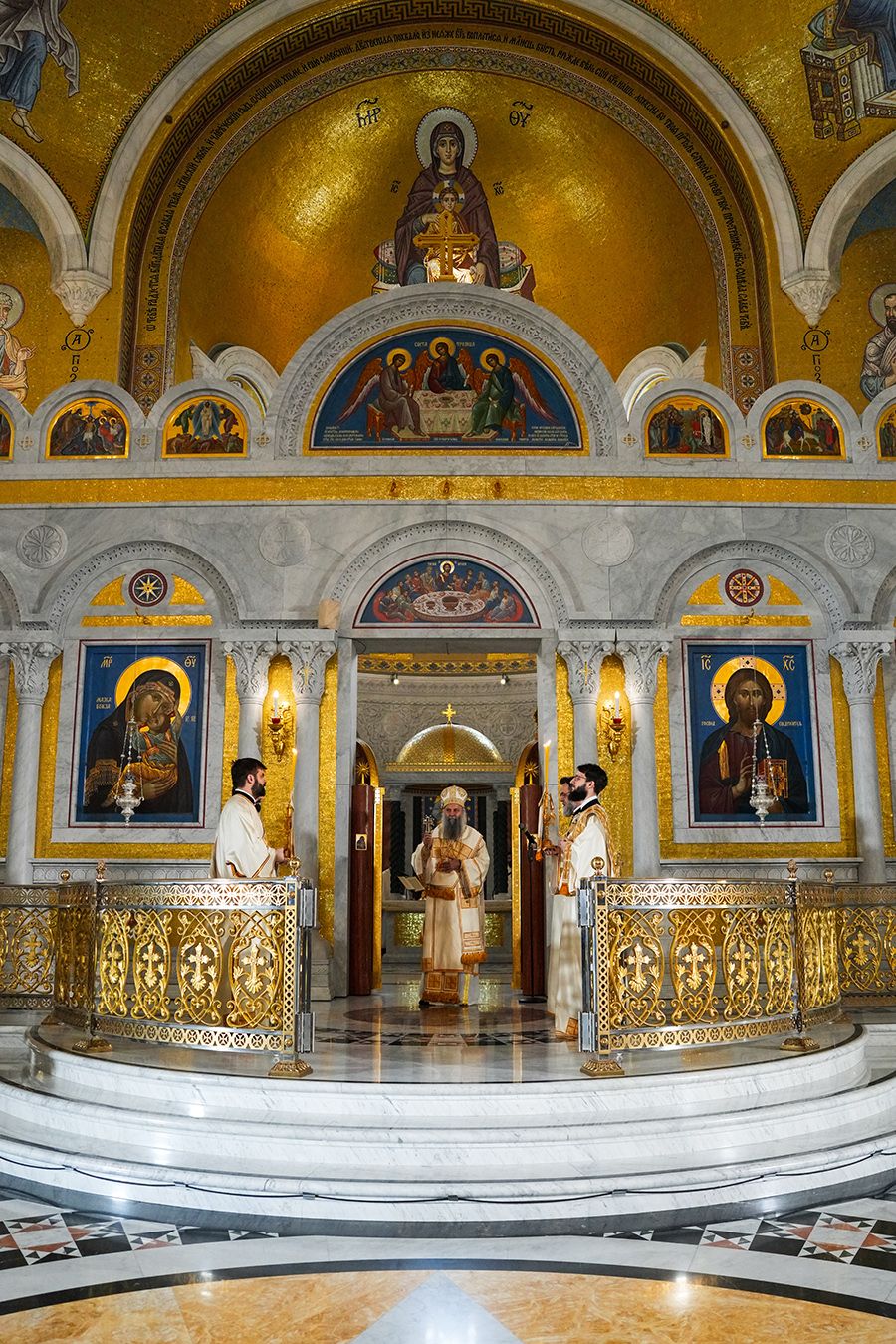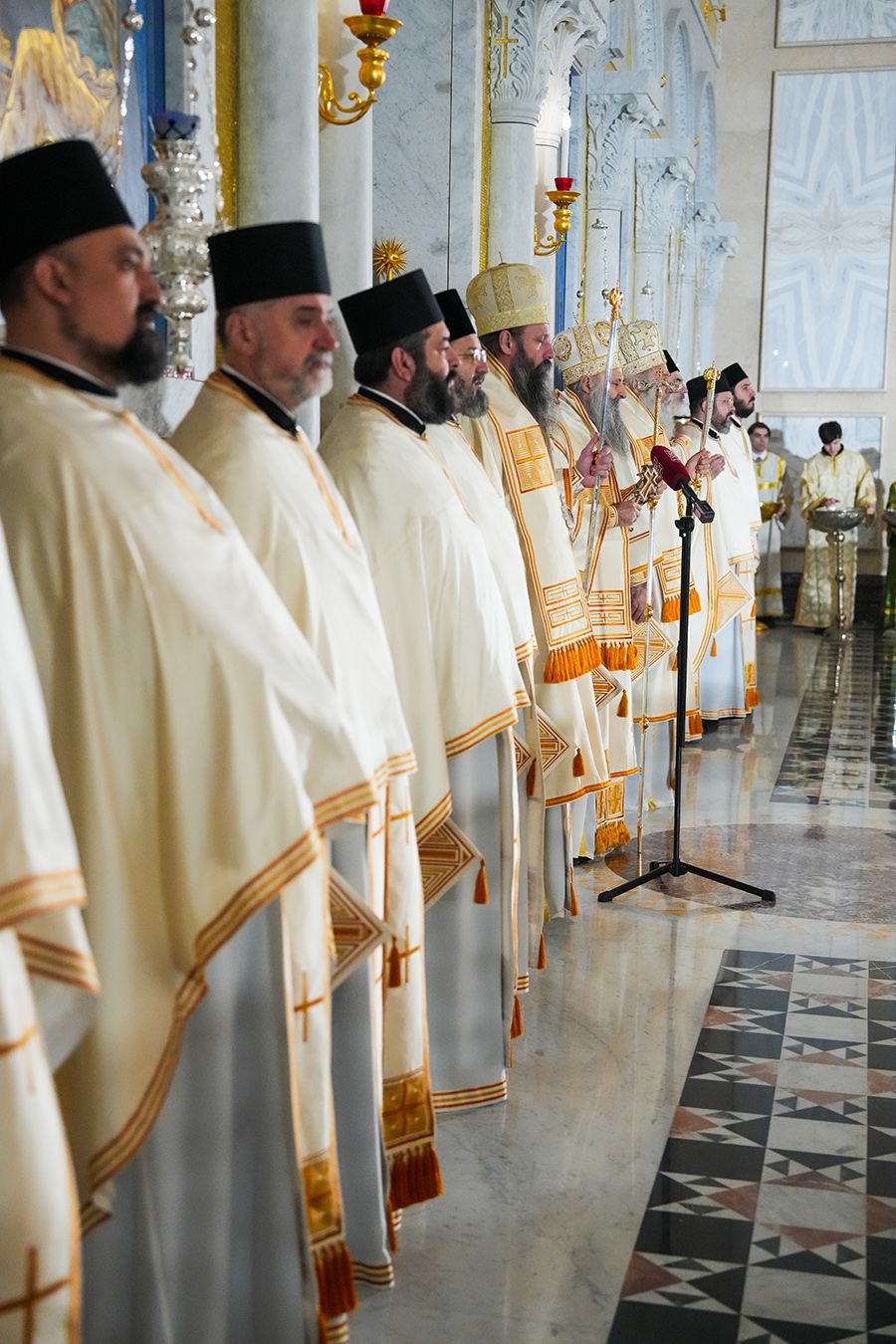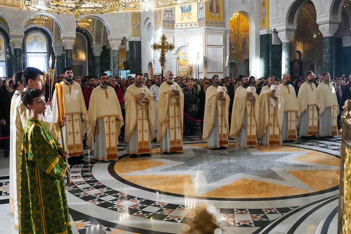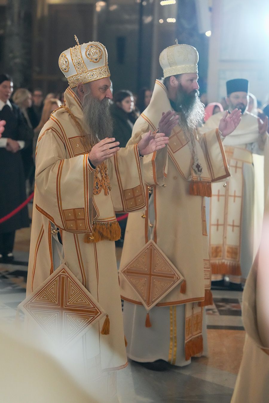 Његовој Светости Патријарху су саслуживали: преосвећена господа викарни епископи хвостански Алексеј и новобрдски Иларион; протојереј-ставрофор Радивоје Панић; протојереј Ђорђе Стојисављевић, шеф Кабинета Патријарх српског; протојереј-ставрофор Димитрије Касапис; протојереји Ненад Јовановић, Драган Шовљански, Иван Штрбачки и Бранислав Кличковић; јереји Далибор Стојадиновић, Дарко Николић, Бранислав Кеџић и Немања Калем; протођакони Драган Радић, Радомир Врућинић и Младен Ковачевић; и ђакони Василије Перић, Марко Поповић, Бранко Гогић, Никола Рашковић и Вук Ерцег.