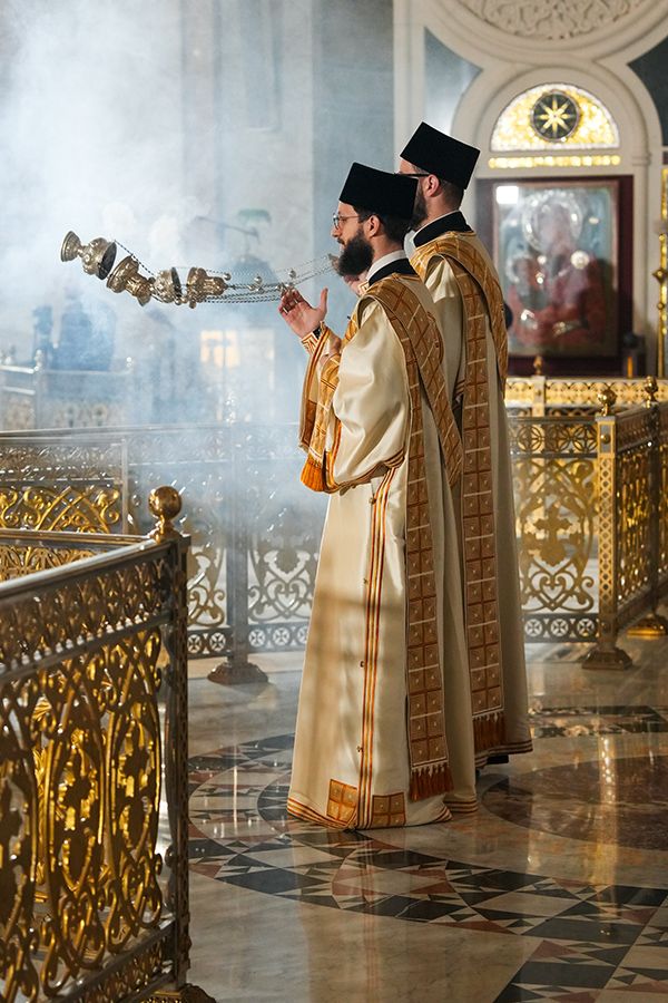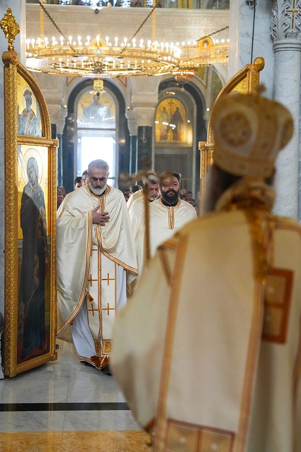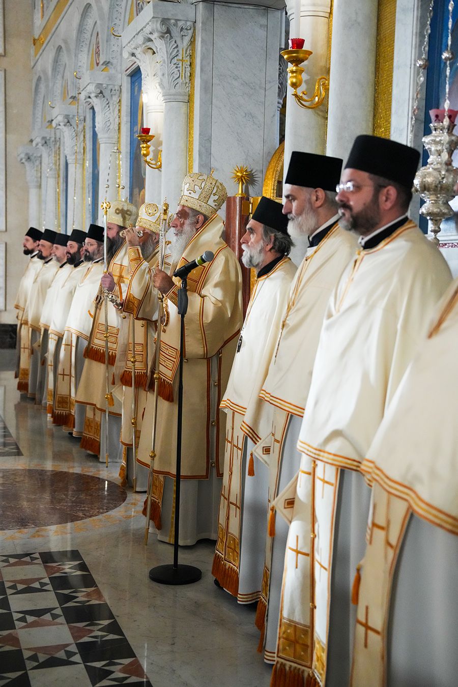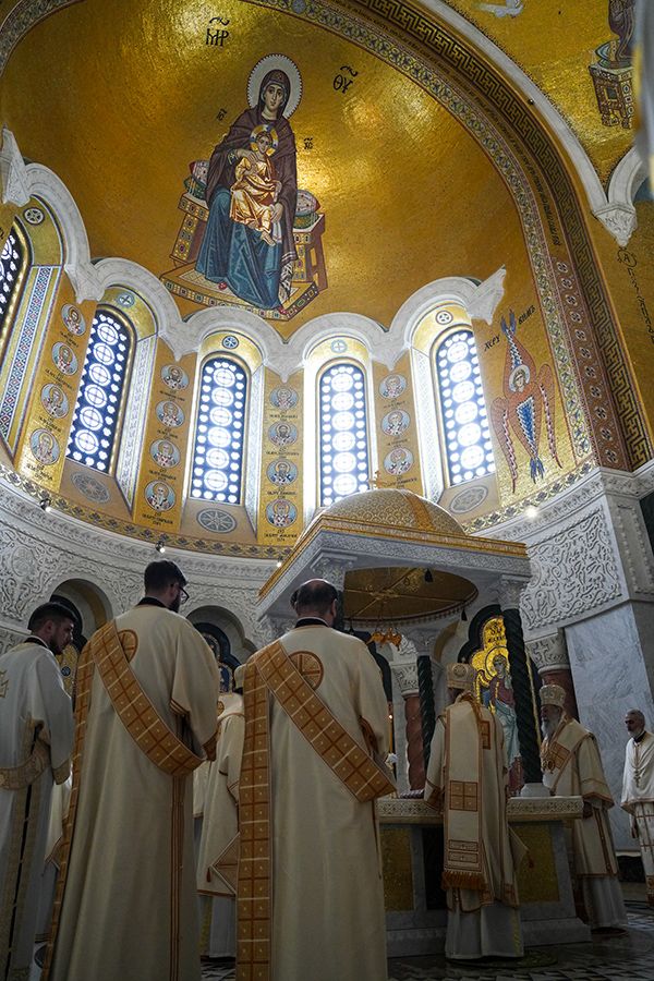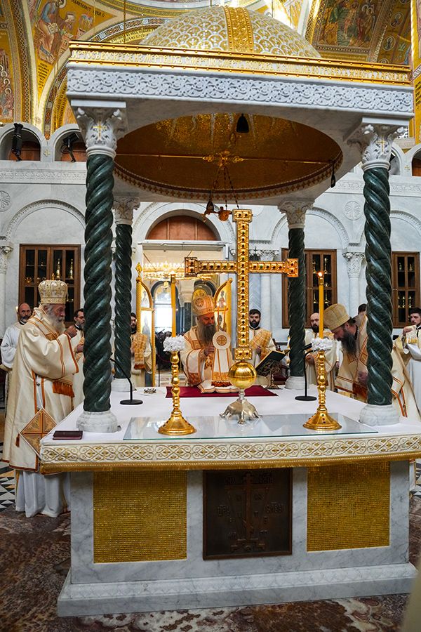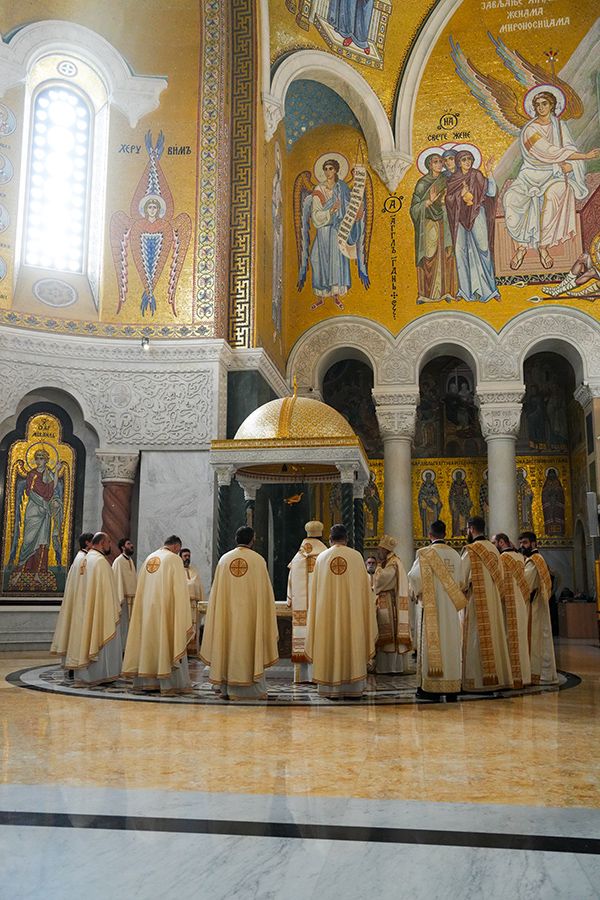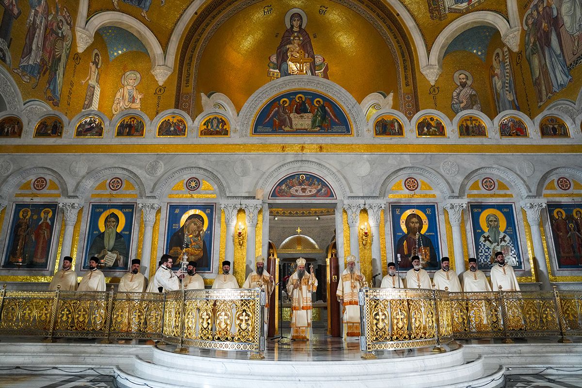 Његовој Светости Патријарху су саслуживали: преосвећена господа викарни епископи хвостански Алексеј и новобрдски Иларион; протојереј-ставрофор Радивоје Панић; протојереј Ђорђе Стојисављевић, шеф Кабинета Патријарх српског; протојереј-ставрофор Димитрије Касапис; протојереји Ненад Јовановић, Драган Шовљански, Иван Штрбачки и Бранислав Кличковић; јереји Далибор Стојадиновић, Дарко Николић, Бранислав Кеџић и Немања Калем; протођакони Драган Радић, Радомир Врућинић и Младен Ковачевић; и ђакони Василије Перић, Марко Поповић, Бранко Гогић, Никола Рашковић и Вук Ерцег.