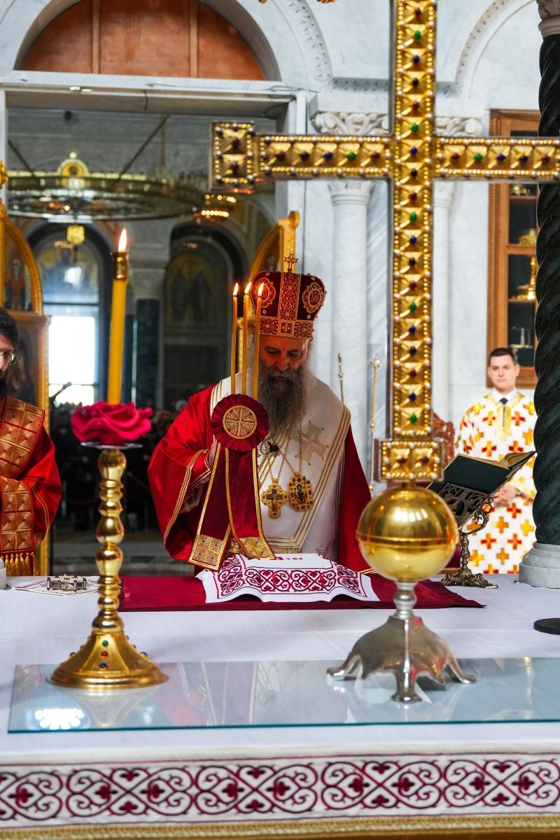 — Ова недеља, од понедељка до недеље посвећена је одређеним догађајима који јесу историјске чињенице али који имају и суштинску, нераскидиву везу са нашим животима и дају смисао нашим животима. Тако данас, на Велики четвртак ми се литургијски, молитвено сећамо многих догађаја који су се збили тог дана, а имају везе и са нашим животима, са нашим спасењем… Сећамо се да је Господ на данашњи дан установио Евхаристију, т.ј. свету Литургију као причешћивање хлебом и вином који су тело и крв Христова. Установио је Евхаристију, установио је Литургију, показујући да је то простор, да је то место у којем се сусрећемо са Господом, у којем исповедамо Господа, у којем га препознајемо — беседио је Патријарх Порфирије и поручио: